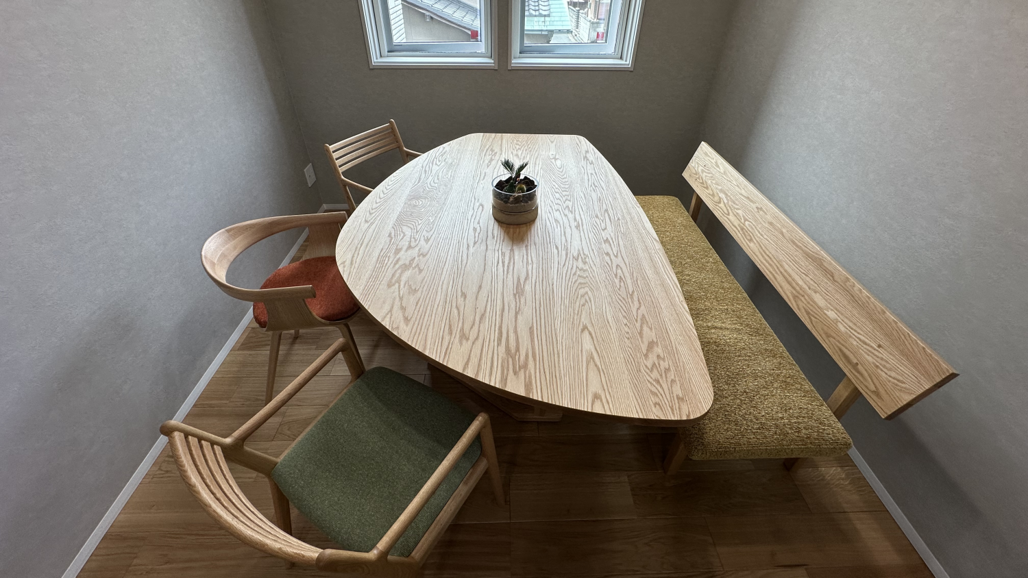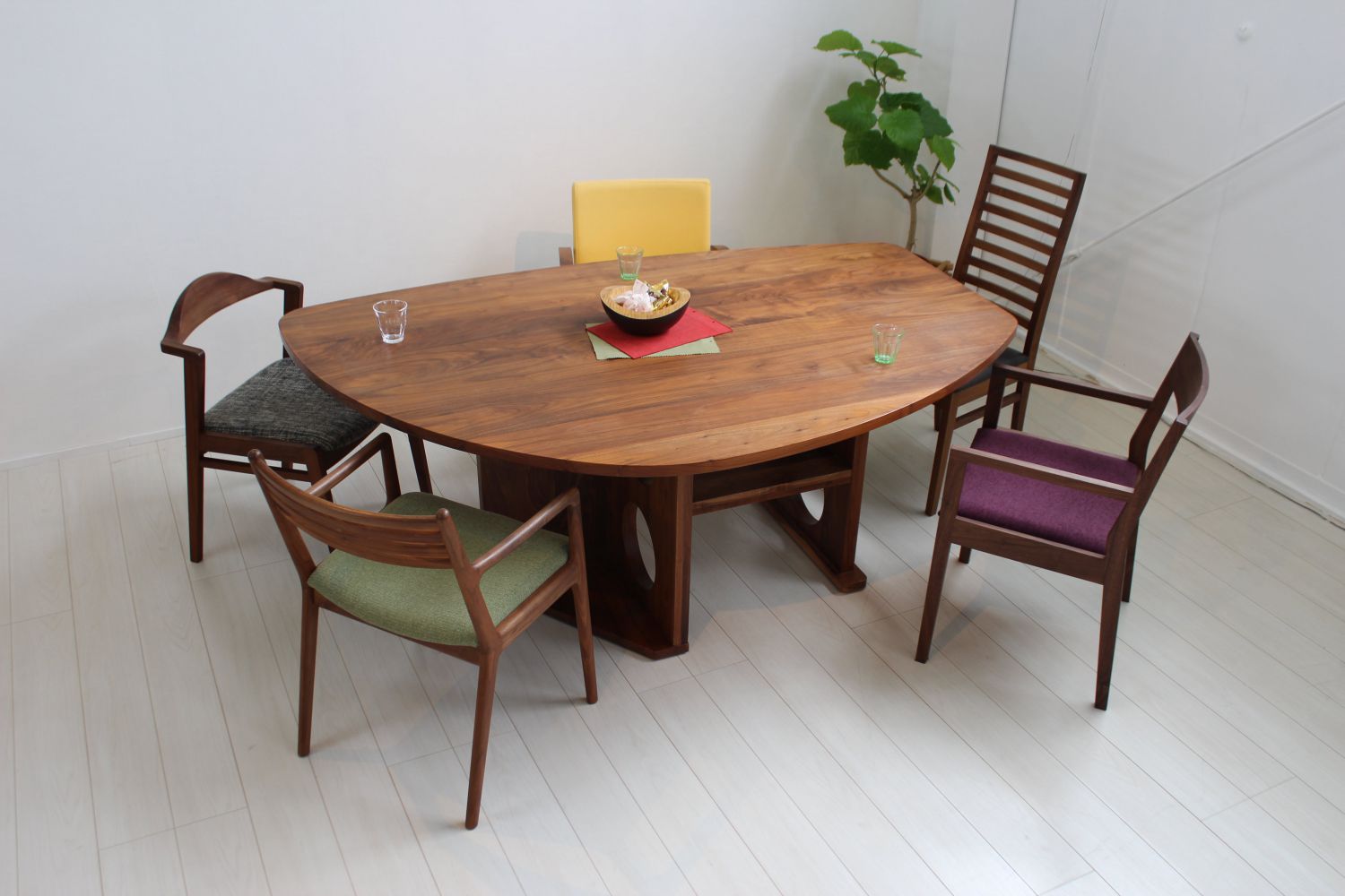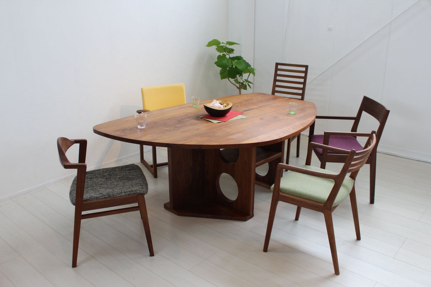 脚が中心部にあるため椅子を入れる場所を選ばず、大人数でも座りやすい変形テーブル。脚部にはデザインアクセントとなる丸いくりぬきが施されており、便利な棚板も付いています。サイズや材種を変えたり、丸いカーブの部分を左右反転する事も可能です。