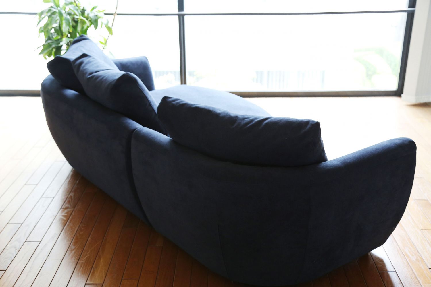 コーナー部分が曲面状なので、すっぽりと包み込む座り心地でくつろぐことのできるソファ。開放感のあるカウチ部分は、上がり込んで自由な姿勢でくつろぐことができます。