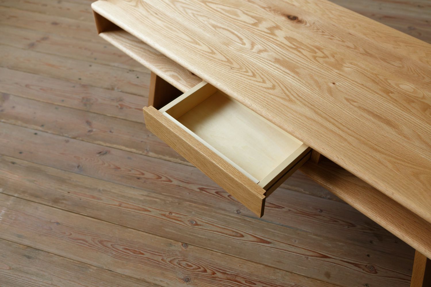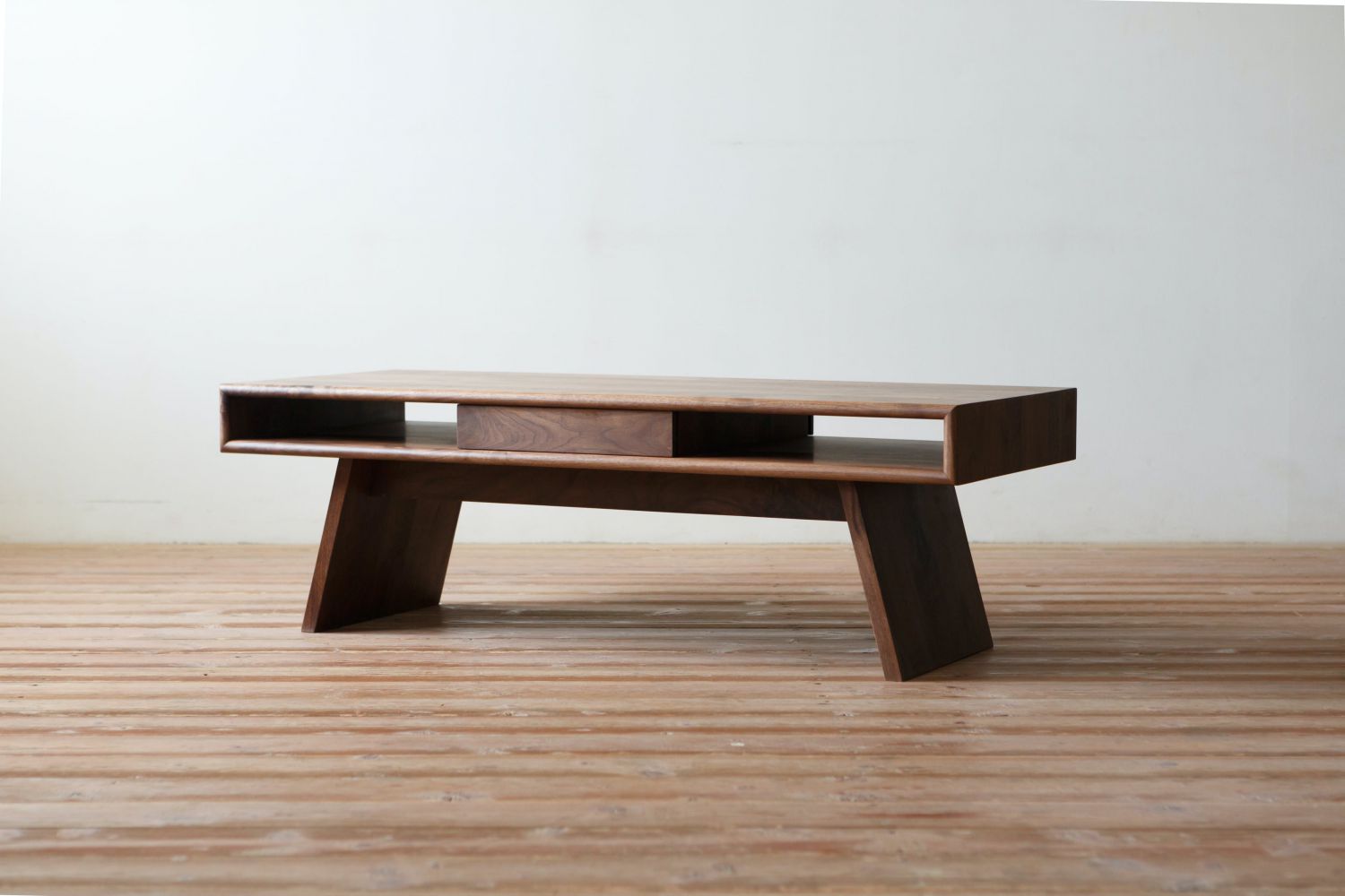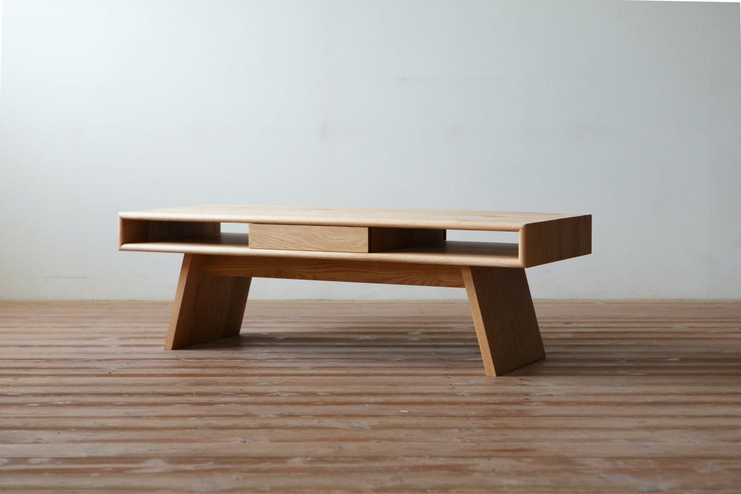 丸みのある柔らかいデザインのセンターテーブル。 棚と引き出しが付いており、リビング周辺の小物をすっきり収納できます。